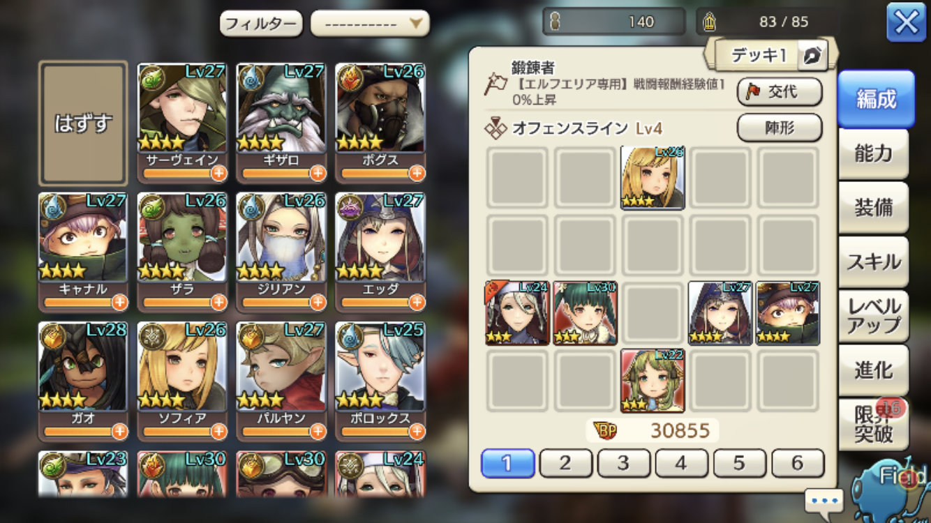 スラヴェイアだけだと回復が追いつかなかったので、ノーマルスキルで単体回復+物理防御バフを付けられるキャナルを投入。属性不一致だけど、ロロミュのクイックで3秒に1回ペースで回復してくれるので大助かり。