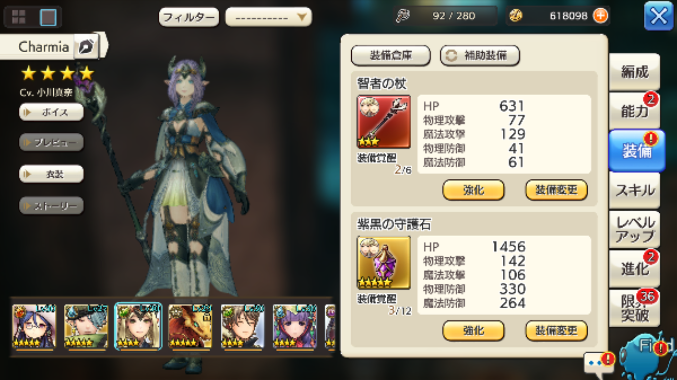 星4マリオン。星3装備。スキルは34214。ダメ増10%。攻撃力1162。
