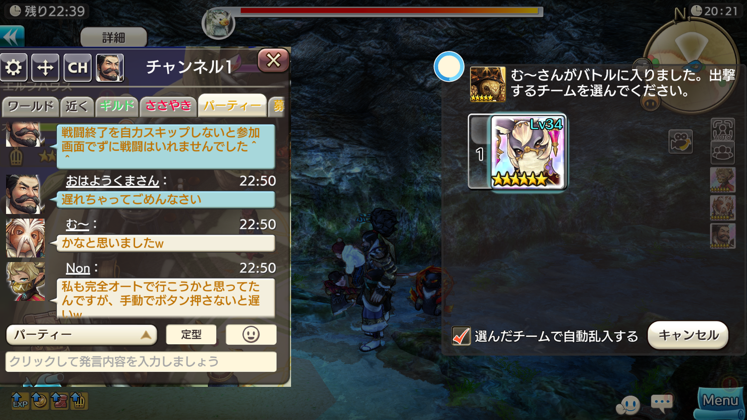 戦闘リザルトの「次へ/確認/確認」を自力で高速スキップしないと、画面変遷が間にあわず、PTメンバーが次の戦闘を超速で開始していたら参加カウントダウン(スクショ3枚目の画面のアレ)が表示されず、戦闘に参加できない──そんなアホなことが連発する事態となってしまいました。