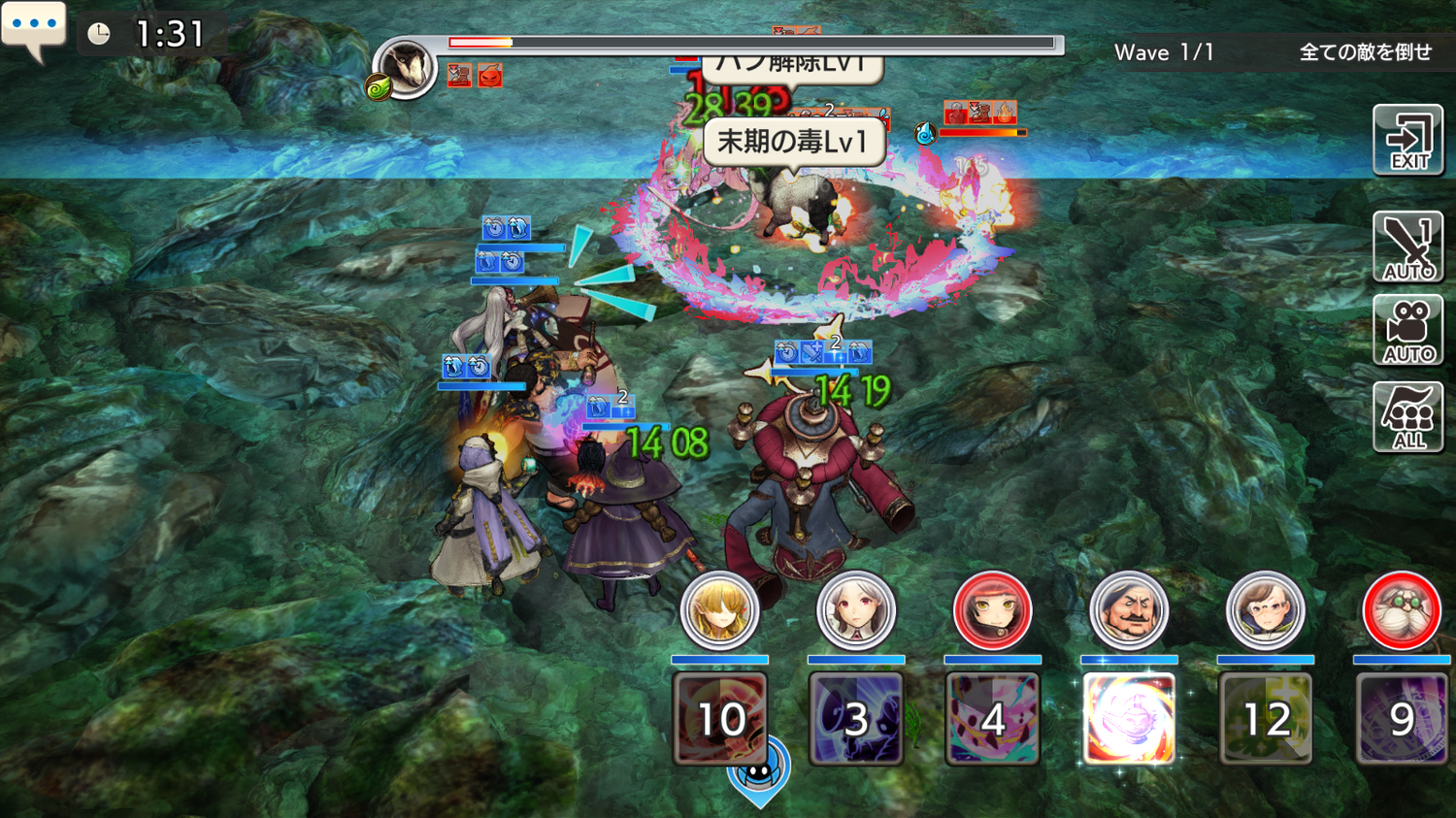 マーサはカリンに混乱が入ったらASタップ、フォルクはカリンに毒が入った場合(目安はHP70%くらいに減った時)にASタップ。