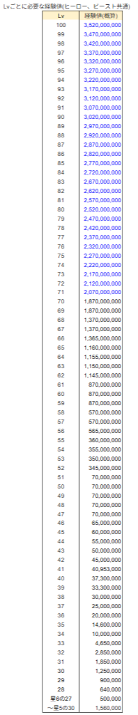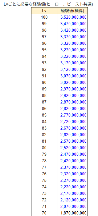 Lv70→Lv100のレベルアップに必要な総経験値は、およそ840億(83,850,000,000)でした。