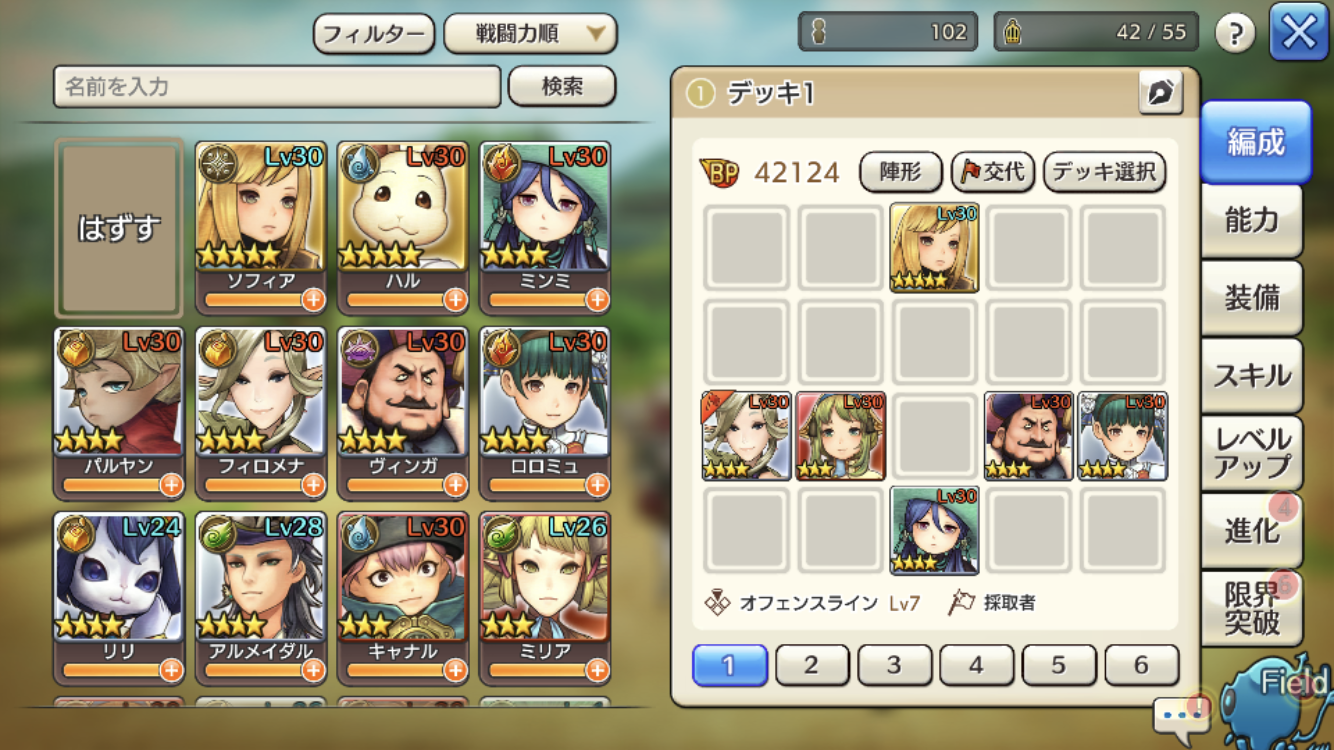 ウチのパーティはソフィアが頭1つ抜けていてミンミ育成中ってところです。レーナはほとんど育ててない…ヴィンガとロロミュにルーンが付いているのはアニマをかき集めた証拠です(*´艸`*)