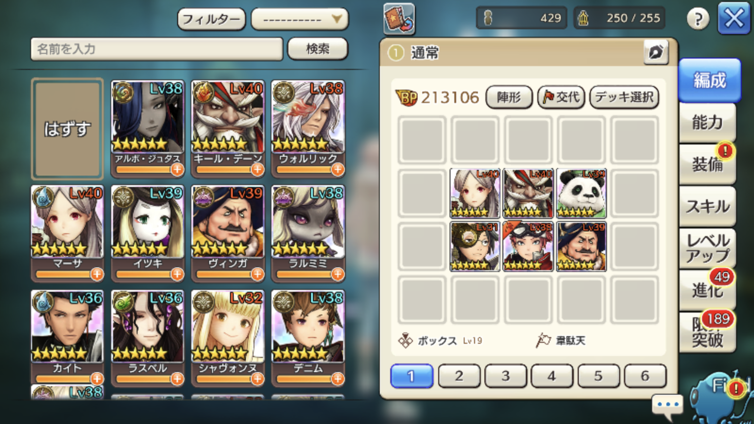 とりあえず参加確定枠のキリアンが星6武器を片手持ってたので今回の火力役として育てることに、ダメ増54減10くらいだったのを修練ちゃんとして、減に少し振り直してダメ増44減27に、レベルを32くらいから38まで上げました!