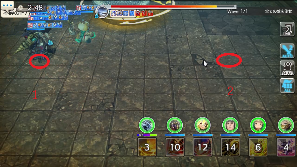 最初に左の位置に行きます。 私よくyoutubeにあがっている動画の通りに左上のほうを目指していましたが、最近ご一緒したPTで単に左にいても大丈夫だよと教えてもらいました(*´ω`)画像の1の場所あたりですね(赤丸のあたりです) そしてauto2にします。