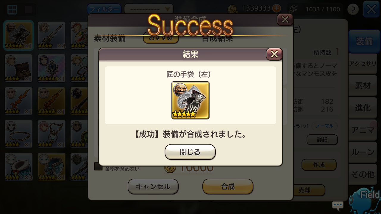 2020/05/31 09:15 公開 ★5うれしー 雑日誌 どうせ出来ないと思ってあきらめてたんだけど、今週思い立って合成チャレンジしたら、1発で★5が2回も!鍛冶工房でも★5が2本♪うれしい(๑˃̵ᴗ˂̵)(写真は1枚ずつしかないw) リコ୨♡୧ リンクをコピーしました 前の旅日誌 旅日誌一覧 次の旅日誌 コメント 1 リコ୨♡୧ ID: b3978d4g2hi3 また来たコレwやはりポイント110で作るのがいい(゚∀゚) 2020/06/13 10:54