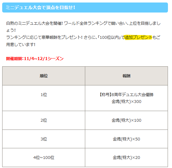 ランキングに応じて豪華報酬をプレゼント! ⇒通常のデュエル順位報酬