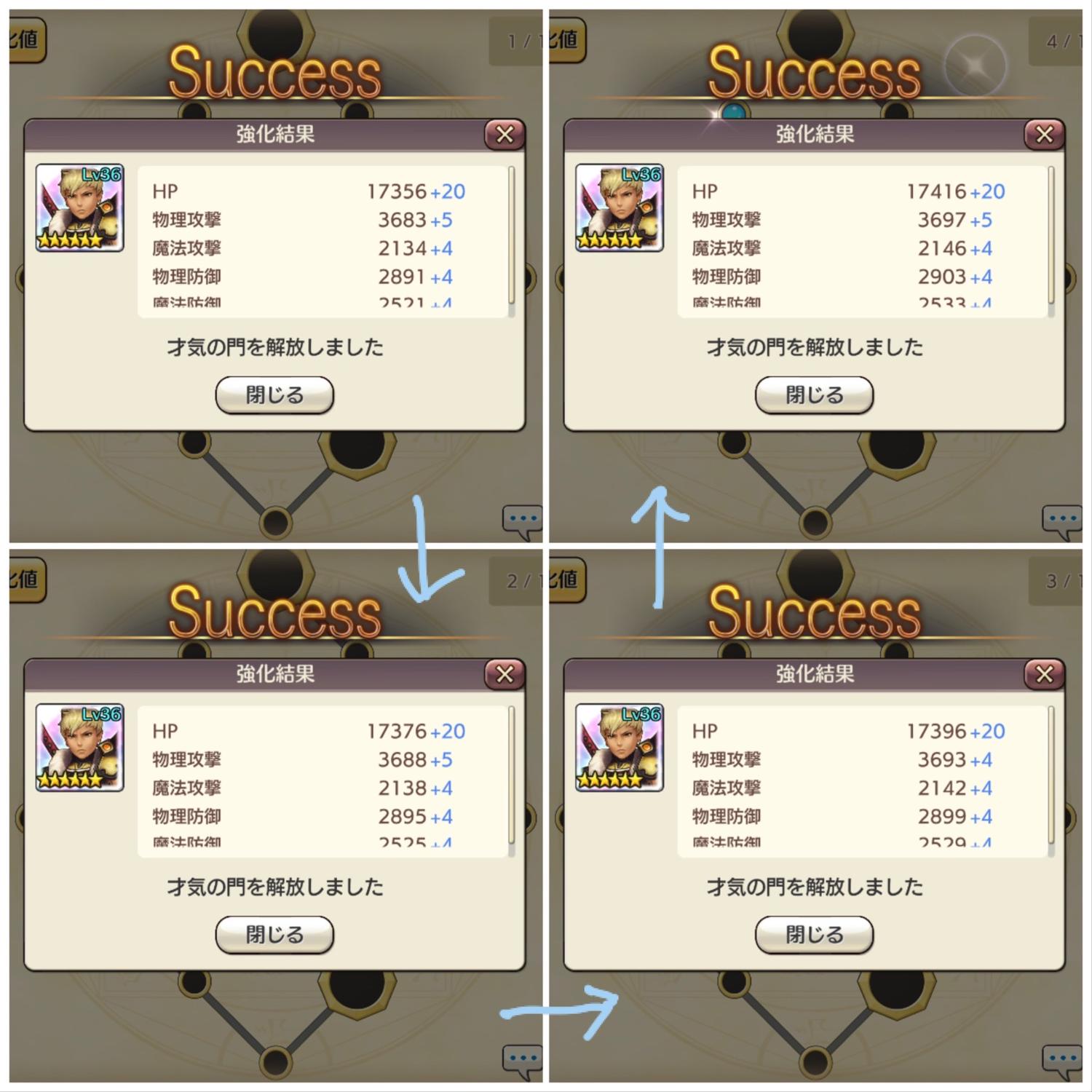 進める毎に必要ゴールドはグイグイと、肝心の数値は微妙〜に、物攻、物防、魔攻、魔防が増えます。