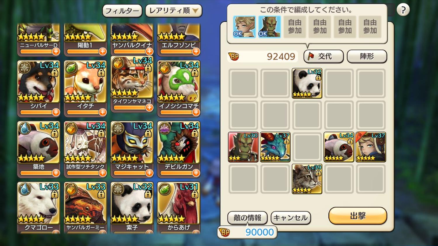 パルヤンは星5で相当鍛えてますが、ドンドロはまだ星3です。パルヤンを生かす為にも物理火力ビーストを探すも全く持っていない事に気付く。物理は爆撃か塔凸なんですよね(汗)という事でパルヤンのバフは無駄ですが、いつもの魔法火力パーティで挑戦。
