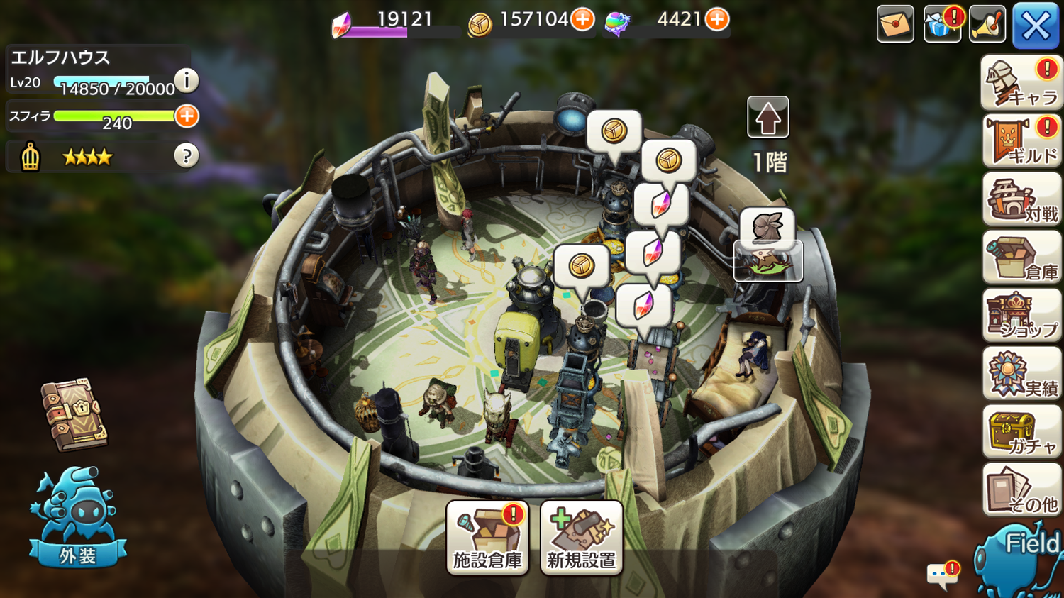 スクショでわかる通り、私のキャラバンはシャッフル前提なのでキャラが施設に重ならないよう思いっきり1Fの生産施設を片側に寄せてシャッフル即判別できるようあからさまに専用スペースを確保しております。