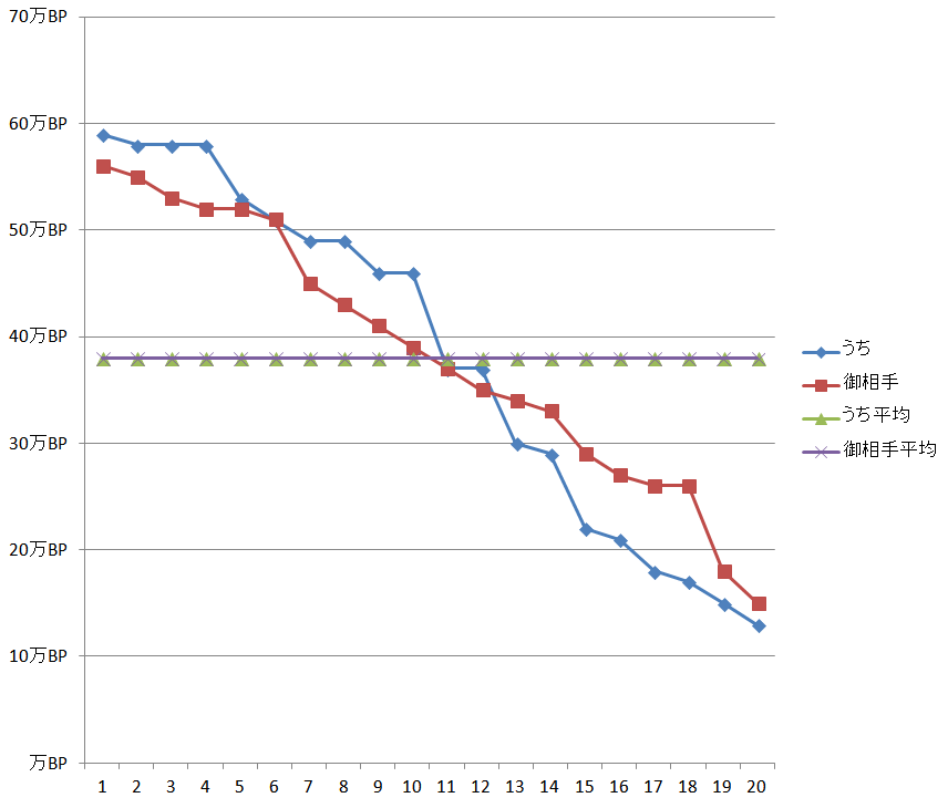平均より上が当方の方が若干高く平均よりしたが当方の方が若干低い。