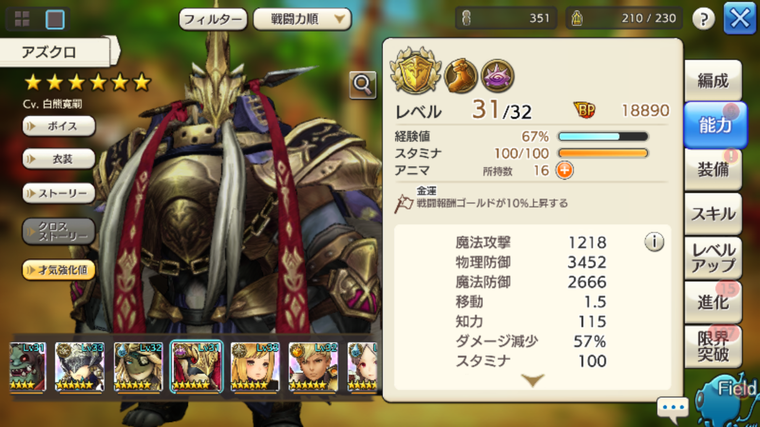 ●グアラルは強制参加。星5、装備は4/4でスキルはほぼ手付かず。タンクタゲでは敵に近づいちゃって事故るので、敢えて後衛だけ面倒見る