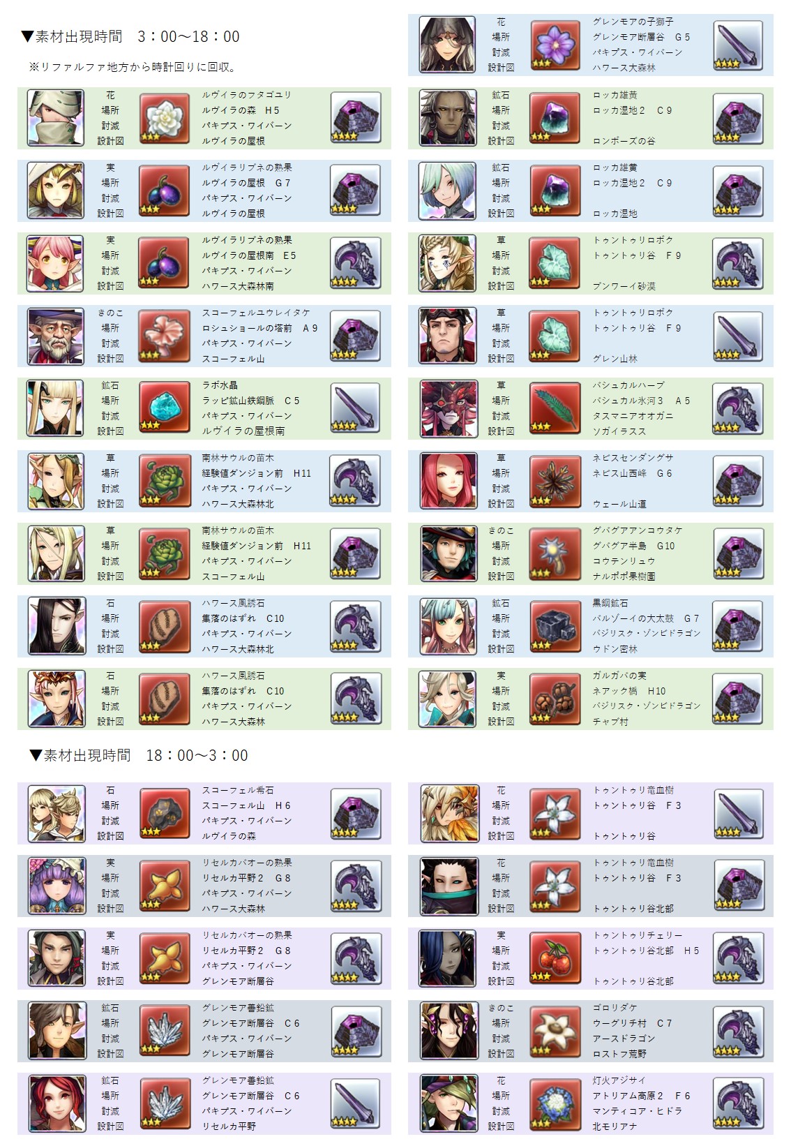 ※設計図や素材が複数箇所で入手できるキャラもいます。一応ミリアとアカリは同素材で二箇所に、プリアはルガルザ村C7でも素材拾えます。