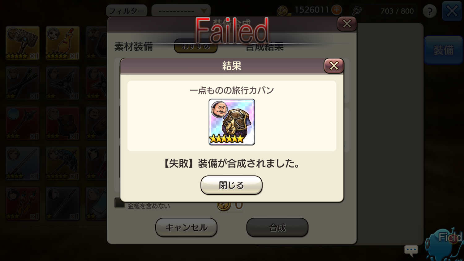 その精神ダメージが癒えた頃に、☆6装備を合成したら当然のごとく失敗して・・・・・・その結果、イケニエ怨念合成した☆6装備と同一のものが生成されたorz