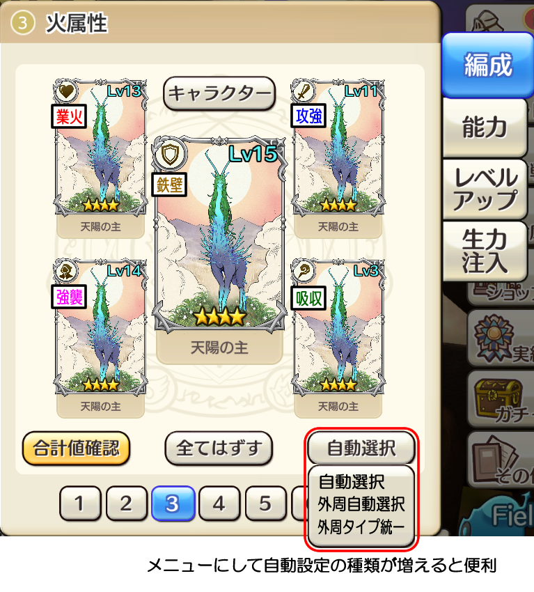 2)外周自動選択: 中心の加護以外のカードを強い順に自動セット
