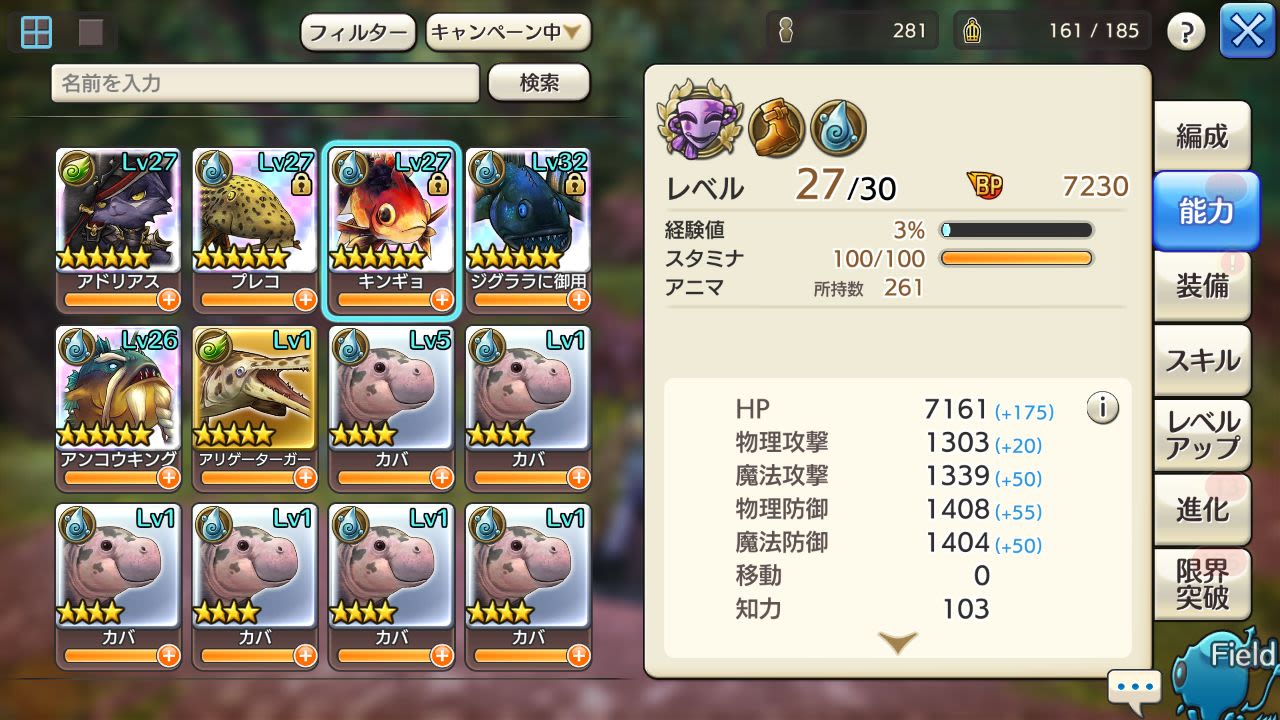 することないときは割とピラクルやっていたのですけど全然捕まらなかった。せっかくだしと思ってキビ団子も10個くらい投げたけどダメだった。☆5テイムはやっぱり運のブレがすごい。ガーはあんまやってないはずなんだけどな…なんか仲間になってるな…