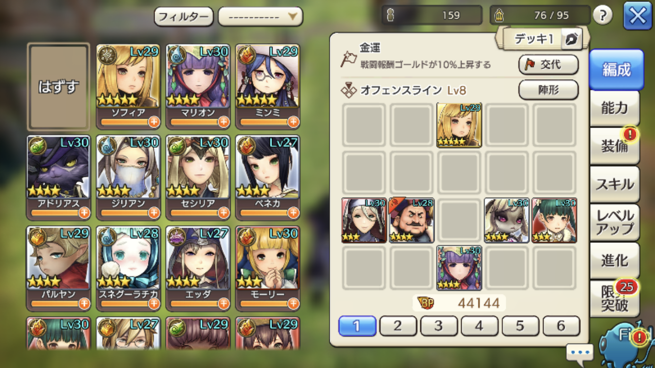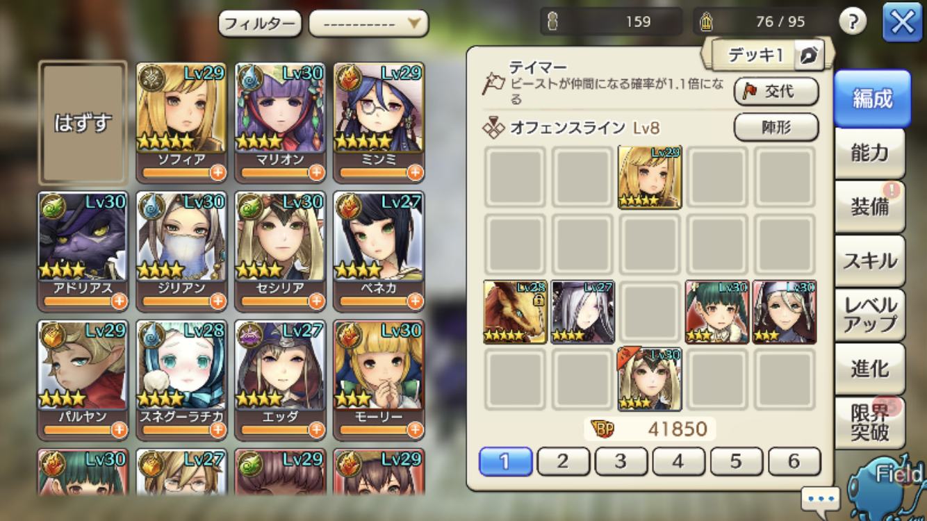 は固定で相手属性に応じて火力バフを変えてます。BP上位はマリオン、アドリアス、ミンミ、ジリアン。最近はオーリュウかエッダ入れることも多いです。