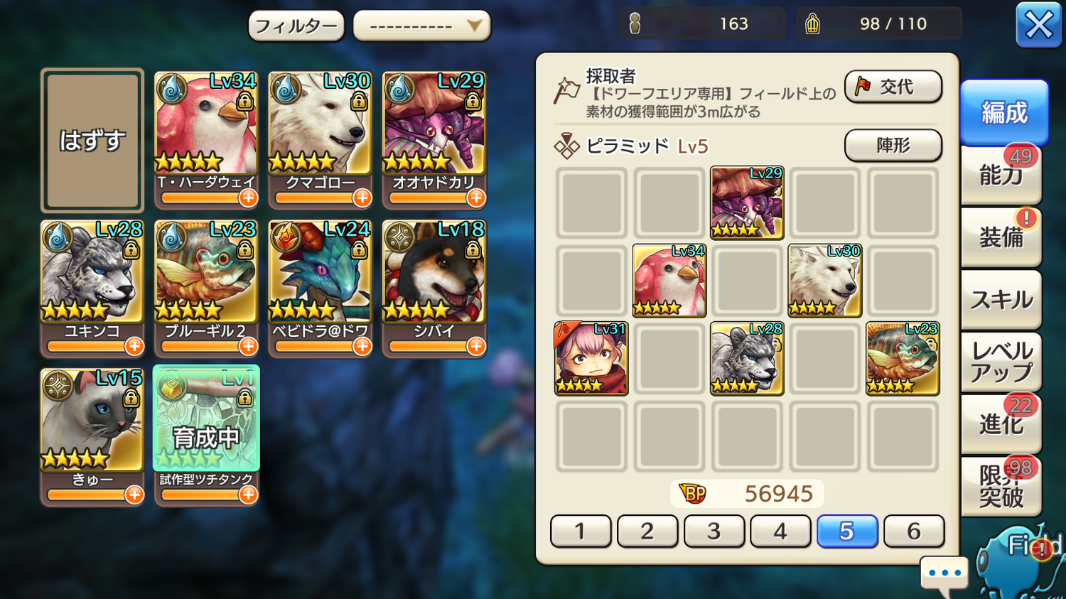 ただ、どう考えても火力が足りないので、レベリングも兼ねてウミイグアナをスカウト中です。ブルーギルのところにウミイグアナで火力アップを狙いたいところ。★5テイムは気長にいくしかないですね~。