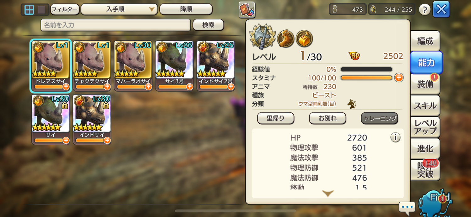 意外とね、クアールやエルダーウータンなどなども最初の進化で出来てるんですよね。その分、☆6のユキヒョウやオランウータンがいない…もう一回育てるにしてもオランウータンはキツいよ…