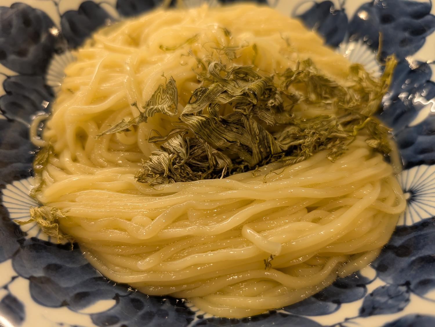 中細の麺にトロリとしたとろろ昆布が合わさり口に入れると加速された様に喉を通り過ぎます