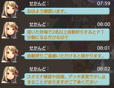 って感じで狩場空いてるから自動巡回1人にさせてくださいってPTチャット打ったら無言で抜けていかれた・・・・気分を害されたのだろうか?