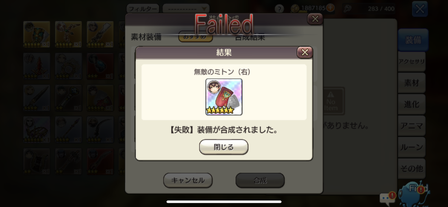 2019/02/27 17:51 公開 ☆6合成チャレンジ〜! 雑日誌 スクリーンショット 育成ほぼ放置もしくは持ってないキャラのメイン☆5を使ってlet'sチャレンジ〜!!!2回だけやって[失敗]アメリア[失敗]フォルクでした( ˘ω˘)( ˘ω˘)( ˘ω˘)アメリア両手☆6が意図せずに揃いました。まだ☆5にも進化出来てません…wソフィアの修練にお守り使いまくりでお守り足りません…(´;Д;`)!!!!ルーンも足りません!!!!せっかくなので、ゆったりのんびり育ててみようと思います₍₍(∩´ ᵕ `∩)⁾⁾ zn(ゾノ) リンクをコピーしました 前の旅日誌 旅日誌一覧 次の旅日誌 コメント 1 きぬ ID: f8qfdivahu2z 密かに、☆6チャレンジしてるーーっ!w両手揃うなんて、いいですよ!これは育てて欲しいなのね、きっと♪私なんて、ユウリ餌にしてユウリ☆6きてフリーズしたわ(;_;)本当に一体育てるのにお金とお守りがどれ程いる事か……時間もかかるし、焦っちゃ気持ちが持たない私もマイペースで頑張りまーす!(*^_^*) 2019/02/28 14:36 2 zn(ゾノ) ID: kyw2hapegtmh >> 1 育ててないキャラのメイン☆5が結構あったのでこっそりと…w回復系育ってないのが見透かされてるようでした( ˘ω˘)スヤァ…もうきぬさんにはきっとグァラルとかユウリを育て上げて欲しいんですよ!きっと!←お守り本当足りないですよね〜〜〜マイペースに楽しんでいきましょ〜♪ 2019/03/01 10:14