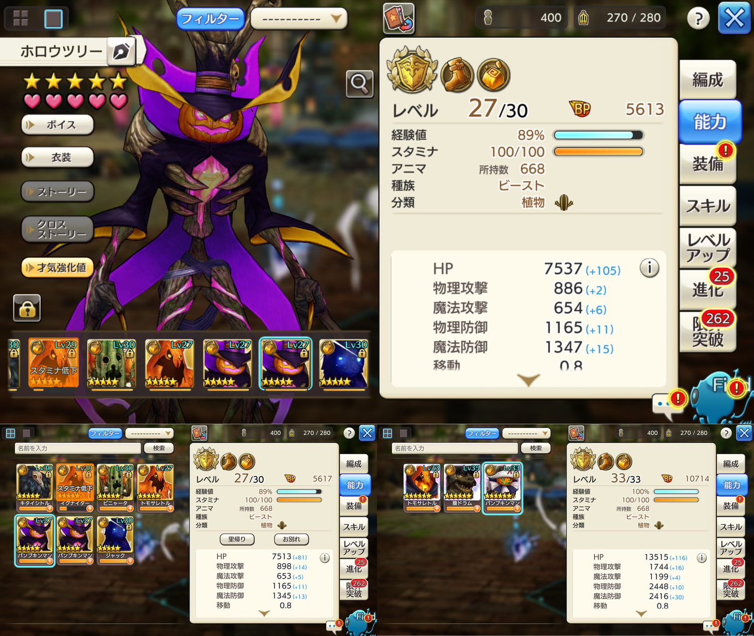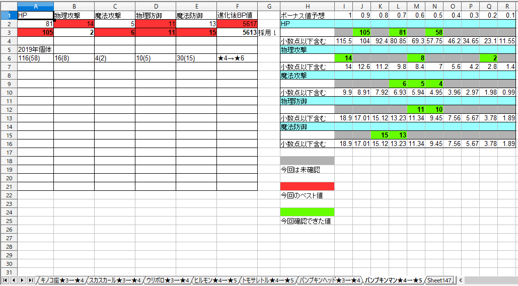 ひとまずハロウィンイベント期間中の選別は以上ですが、この後の周年期間中に延長戦の予定です。準備が終わったのはデビフライ、デビルガンの2種とアニマタップ次第ではフールンケンも行けそうな感じでした。