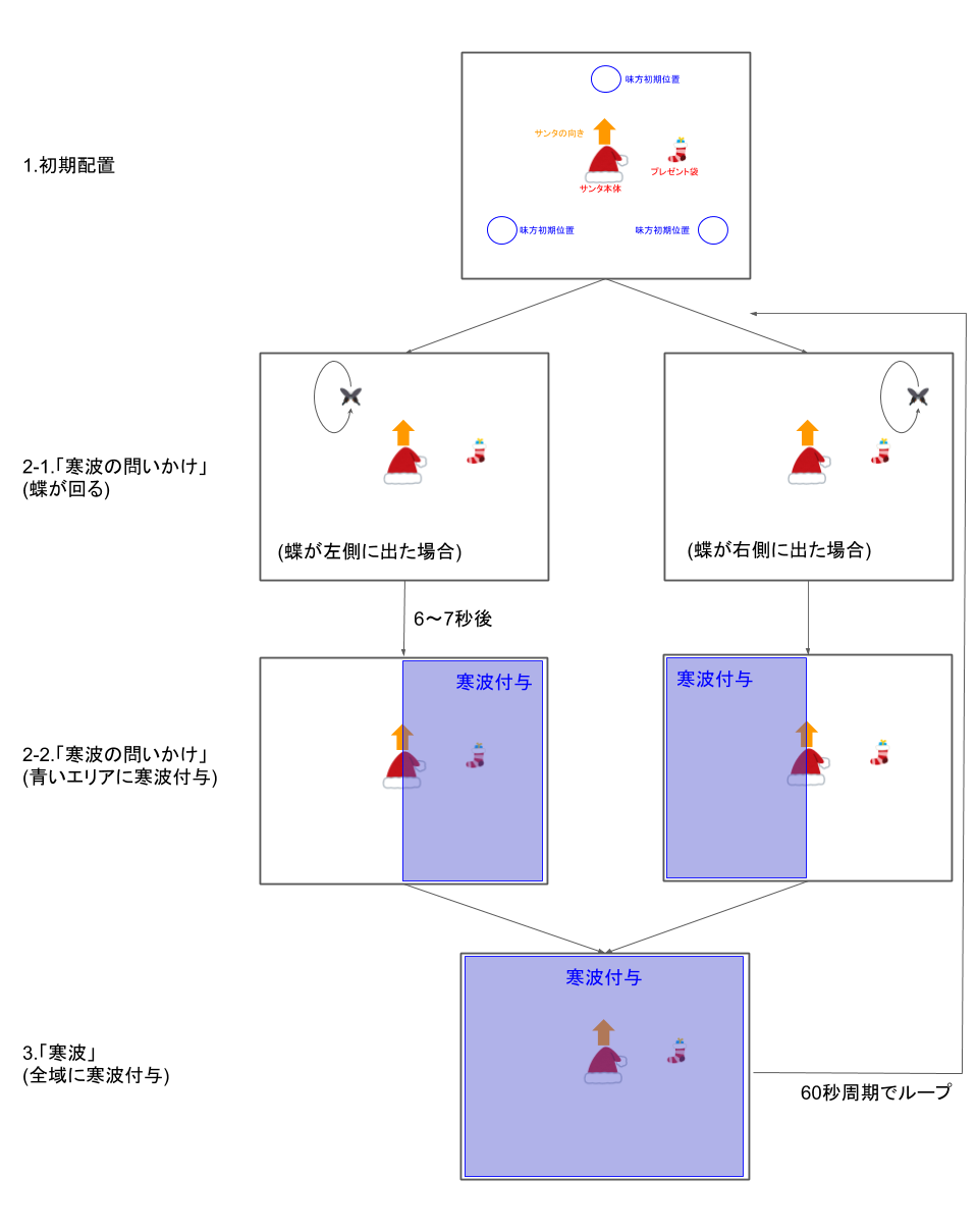具体的には、サンタから見て左右どちらかに蝶々が舞うエフェクトが発生し、その後そのエフェクトの反対半域に寒波が付与されます。