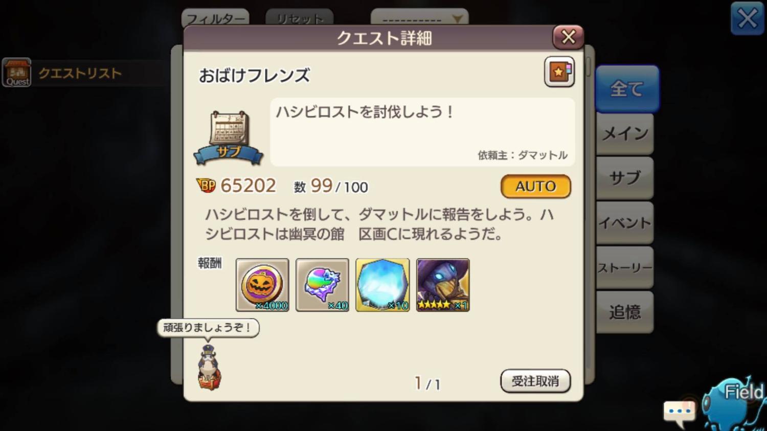 2019/10/24 12:19 公開 おばけフレンズ ハロウィンイベントで★5のモンスターが手に入る。貴重だが低レベルの私にはきつい・・・。狩りに来た皆様に便乗させて頂きながらクエストを終わらすことが出来ました。ありがとうございます(*'▽') モンジュ リンクをコピーしました 前の旅日誌 旅日誌一覧 次の旅日誌 コメント 1 ルナのジェシーち ID: c7kj2wkfftjb おめでとうございます。 2019/10/24 12:19