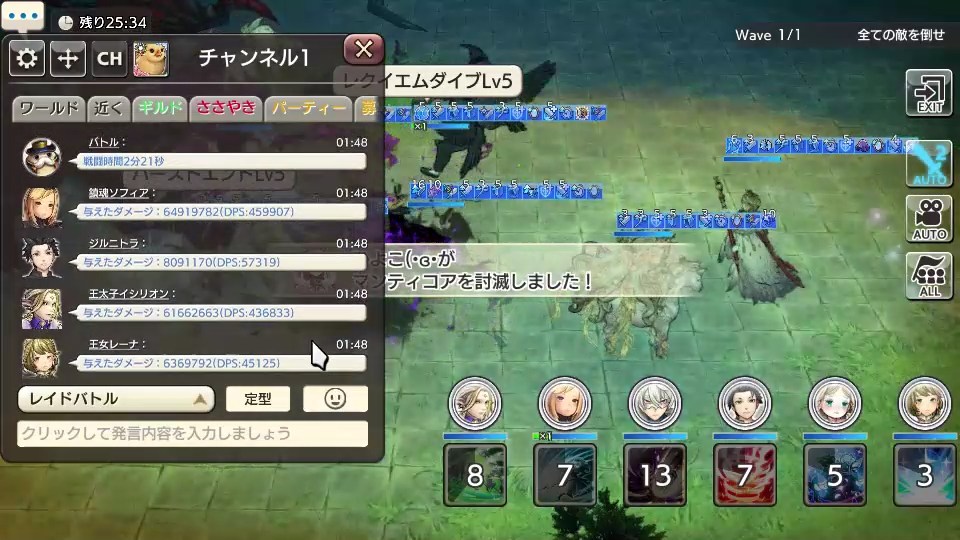 戦闘中盤ごろから前衛がカウンター当てたいイシリオンと聖閃(白チーム)、中衛がカウンターの無い鎮魂とジル(黒チーム)、後衛がサポーター陽雪&王女(白チーム)といういい感じの配置になってきます。