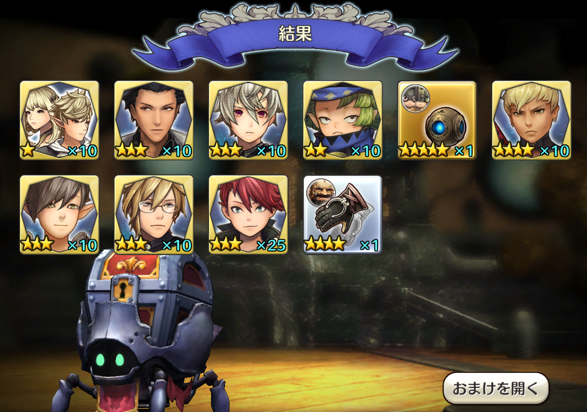 2020/04/08 01:52 公開 イエ島ゆり祭りイベント開催記念500幻魔石ガチャ 運命の箱 スクリーンショット 開催期間4/7(火)メンテナンス終了後~4/14(火)メンテナンス開始まで(予定)必要幻魔石数1回:500個おまけプレミアムpt120/クリスタル1000/キャラバン外装1個(★3~★4の主砲/副砲/装甲の中からランダム)~~~~~~~~~~~~~~~~~~~~~~~~~~~~~~~~~~~~ガチャ久々に引きましたアニマが増えるのは有難いですが、本当に★4装備はいらない… 光人 リンクをコピーしました 前の旅日誌 旅日誌一覧 次の旅日誌 コメント