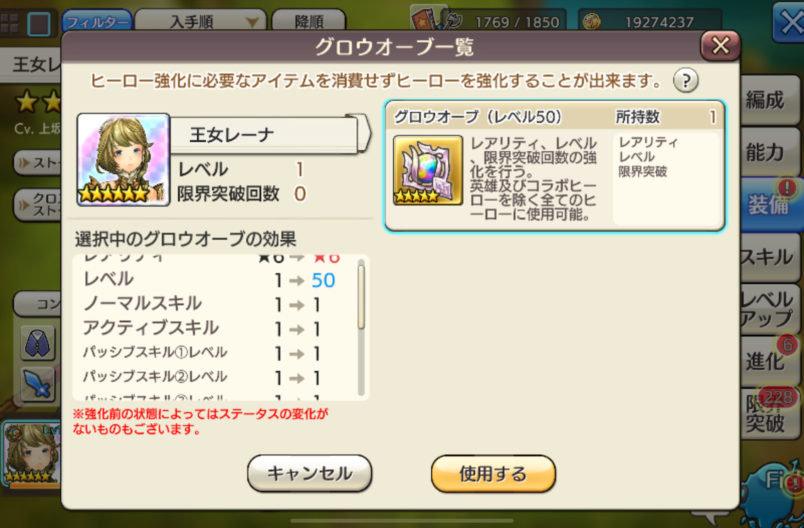まず☆6装備持たせて、こないだ貰ったグロウオーブ使っちゃいます。他キャラは☆6Lv40くらいまでは育ってるのでグロウオーブの有り難みが少ない。あとはとりあえず金埋め、アニマも十分あるので才気解放、スキルとルーン、てとこかな。