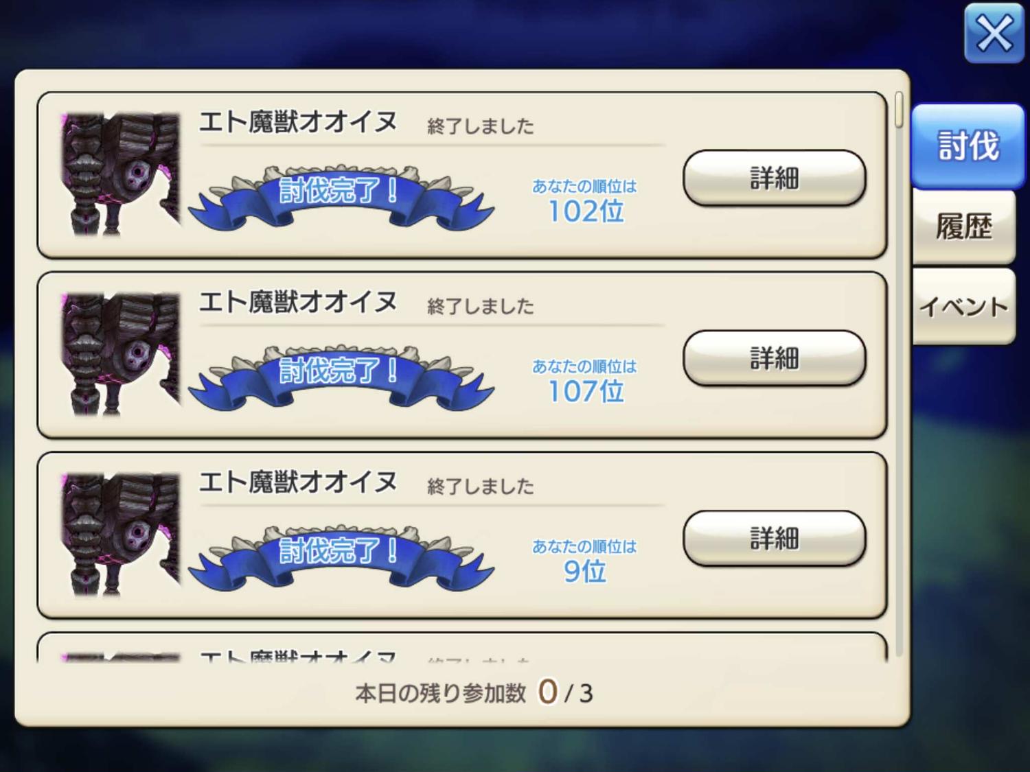 2021/03/20 05:23 公開 昨日の出来事の日誌 雑日誌 ギルドメンバー募集 スクリーンショット 写真1 カシモラル犬祭り 夜にイヌLv3 が2匹登場し、2匹とも討伐されました。写真2 波で手に入った装備袋・銅 フィーロの☆5装備が出ました。 ルル リンクをコピーしました 前の旅日誌 旅日誌一覧 次の旅日誌 コメント 1 〓ふぅか〓 ID: i46vdg68vvh2 今日、初めてヒーロー装備銀袋×2ゲト…中身は☆3で波乗りに心折れる日々です_(:3」z)_初日に2連ちゃんで☆5引いたからかなぁそれ以来パッタリです(つД`)ノ 2021/03/20 22:25