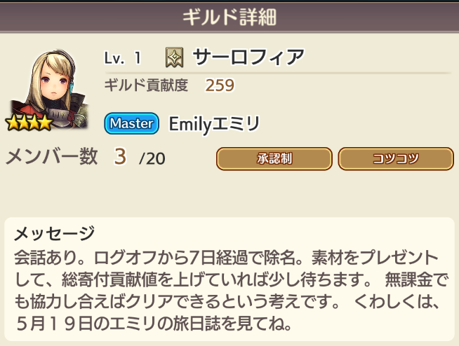 3.ログオフから7日目に除名対象となりますが、素材プレゼント交換により付与される「総寄付貢献値」とイベント出席率などを重視します。 つまり、活動状況によっては除名されない場合があります。