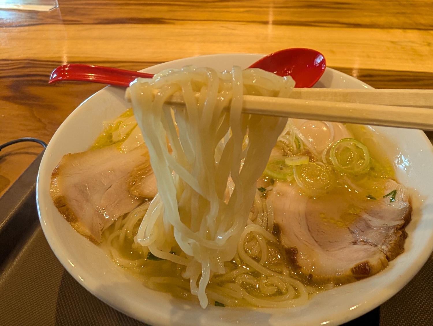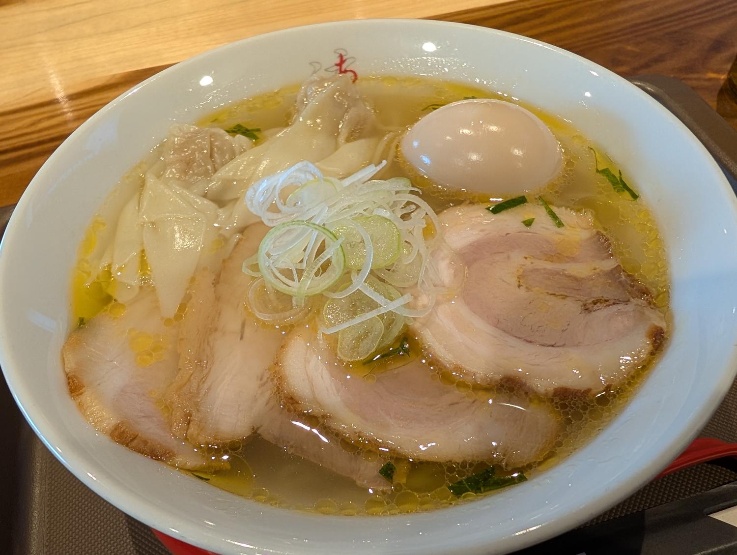 澄んだスープにチャーシューにワンタン、薄い小口切りのネギがもぉたまらん