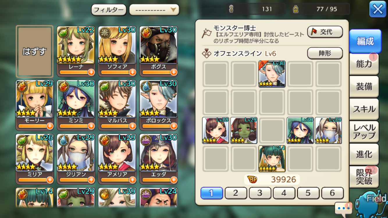 ポロックスとその他は、事故のないように、なるべく離しました。ザラのアクティブスキル押してから、ジリアンとミンミのアクティブスキルを使う。全員のスキル押してから、ロロミュスキルを押すという順番を意識しました。