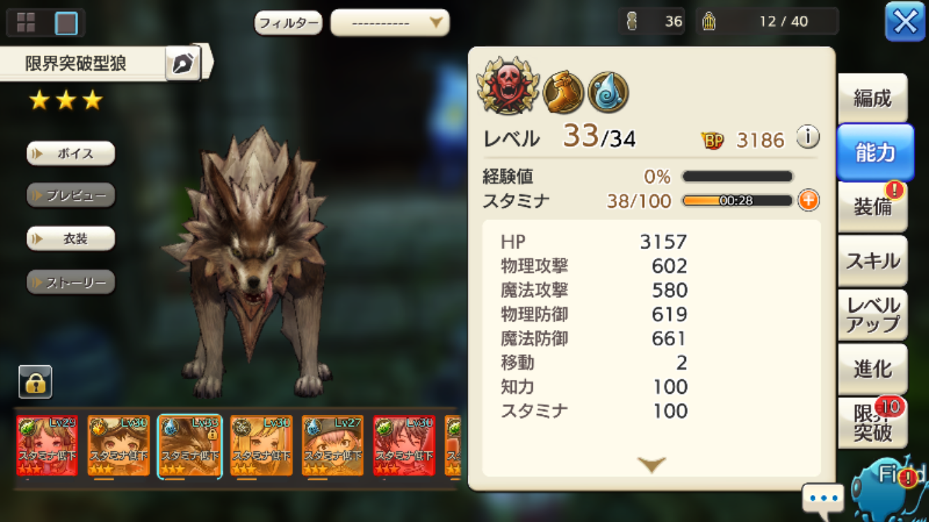 2018/01/22 06:37 公開 限界突破型狼 その3 雑日誌 限界突破型狼、凄いぞ、カッコエエぞ。つ、強い(弱い)イベントの個人報酬はカンストしましたので、本腰を入れて狼を強化している昼飯時です。というか今回のイベントはキツかった。全部オートに出来ないとかね、もうね?あと、そろそろ在庫の狼くん達が心許なくなって来ました。つまり急募 [狼の効率的なテイム方法]現状は石3000以上のテイマーリーダー、たまにアイテム使用の放置です。他に何か確率を上げる要素があるのか否か、、、あ、イベント待ちか? 昼飯時 リンクをコピーしました 前の旅日誌 旅日誌一覧 次の旅日誌 コメント 1 レグナクロックス ID: eiwgxhinfik8 ? 2018/01/22 09:11 2 禍鬼 ID: a3jeggkpwzkt 放置待ちが多分一番ですね…( ´∀` ) 2018/01/22 10:02