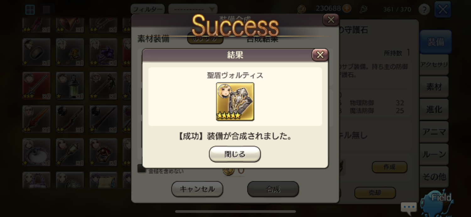 「わかってるだろうがお前今度は絶対に成功させろよな… また次失敗しやがったら嘆きの泥土に頭から沈めてやっから覚悟しとけよ…」という熱い思いというか、もはや執念を通り越した脅迫のような声には出さない念を込めてボタンをポチりしたら、メイン・サブとも2回目で☆5 装備が出来上がりました。