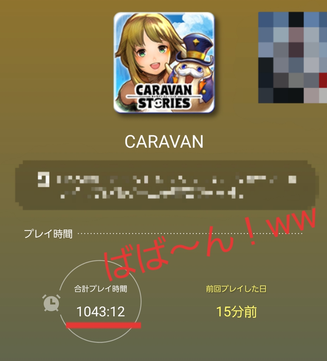 2019/09/21 04:12 公開 気がつけばプレイ時間がすっげぇぞっww 1000時間オーバーしてたwすごい、すごいぞ!プレイ時間だけはっ!!!!www皆さんはほんとにこう・・・色々考えてやってはるんやなぁ、と・・・とりあえずちょっと・・・ちょっとしかない頭使ってやりますっ!誕生日からっ!!夜が涼しくなってきました!風邪引いたらだめですよぅ('ω'乂) あるか-雪月華- リンクをコピーしました 前の旅日誌 旅日誌一覧 次の旅日誌 コメント 1 あぷ ID: gwfjq7fpt3hd え?!プレイ時間なんて見れるんですね!見方教えて下さい(>人<;) 2019/09/21 07:03 2 春雨 ID: cp34wtzfka4f スマホはgalaxyですかね?笑こちらも同じUIでプレイ時間が表示されております!1000時間でキャラバンLv29ってすごいと思ってしまいました・・・。こちら3758時間でまだLv28です・・・。強化さぼりすぎなのかな、と思ってしまいます^^;ゲーム内でもプロフィールとかにプレイ時間やらの情報が出たらいいのにー(*'▽')♪ 2019/09/21 11:03 3 あるか-雪月華- ID: 54wyq3m8nhpm >> 1 コメントありがとうございますっ!えーと、スマホにもともとついている機能のようで、キャラストなら「○○年○月○日に始めた」とかも表示されます私のスマホでは「ゲームランチャー」という名前で、ゲームをインストールしたら、そこにアプリが一括して入る仕組みになっているようです(そこから外す事も可能)もしかしたらアプリとしてあるかも知れませんので、良かったら探して見てください!私のスマホはGALAXYs8NOTEという、約2年前のものです!きちんとお答えできなくてすみません(><) 2019/09/21 22:29 4 あるか-雪月華- ID: 54wyq3m8nhpm >> 2 お返事ありがとうございます!はい、s8NOTEですw色んな人から本当に色々と教えて頂けたので、Lv.29まで行ったのでしょうか・・・皆さんに感謝してます<(_ _)>というか春雨さん3758時間・・・オオオオオオオ!!スッゲエエエエエエエヨオオオオオ!!!( ՞ o՞)w色んな人の色んな情報を、可能なだけ見てみたいです!((o(。>ω<。)o))たくさんの人に支えられて生きてます(ˊo̶̶̷ᴗo̶̶̷`)੭これからもこんな日誌を書き続けて行きますので、宜しければお願いしますm(_ _)m 2019/09/21 22:37 5 あぷ ID: gwfjq7fpt3hd >> 3 詳しくありがとうございます!此方iPhone使用で、アプリ等探ってみたのですがどうやら見られない感じでした(;ω;) 2019/09/22 05:50 6 あるか-雪月華- ID: 54wyq3m8nhpm >> 5 こちらこそ稚拙な説明ですみませんでしたm(*_ _)m私がこのスマホ(GALAXYs8NOTE)からキャラストを始めたからでしょうか・・・なんだか申し訳ないですm(。>__<。)m 2019/09/22 07:10 7 春雨 ID: cp34wtzfka4f >> 4 同じくgalaxyのnoteでキャラストしております!基本ソロでプレイしているので・・・。やはりMMORPGなのだから沢山の人と関わらないといけないと思わされました( ´∀` )これからはもう少しオープンにしていこうかと思います(笑キャラストは個人的に一番好きなゲームなので(*'▽')次は2000時間目指してください!お互い頑張りましょ~♪ 2019/09/22 11:35 8 あるか-雪月華- ID: 54wyq3m8nhpm >> 7 スマホ同じ嬉しいですw色んな人から聞いて、それを忘れてまた同じことを聞く(ループ)という事が多いですけどwでも、こういうゲームをアプリに入れたのは初めてで、今までずっとこれしかやってないので、なんというか・・・こんなのでも構ってくれる人がいらっしゃいます(⸝⸝o̴̶̷᷄ o̴̶̷̥᷅⸝⸝)アリガタイ・・・私もあまり人と関われない感じでやってたのですが、いい人が多くて嬉しいです∩^ω^∩ま、たまにアレなひとがいらっしゃいますが・・・^^;お互い楽しいキャラストライフを送りましょう!(●︎´▽︎`●︎) 2019/09/22 21:23 9 春雨 ID: cp34wtzfka4f >> 8 そうですよね!!!同じくいい人が多い印象です♪いやーホントにキャラストが楽しいんですよ~♪サーバーが異なっててもこういうサイトで交流ができるのも個人的には楽しいです(*'▽')サーバーの行き来とかできたらいいのに(笑まあ、無理なんでしょうが^^;違うサーバーですが、お互い楽しみましょう~♪ 2019/09/23 10:13