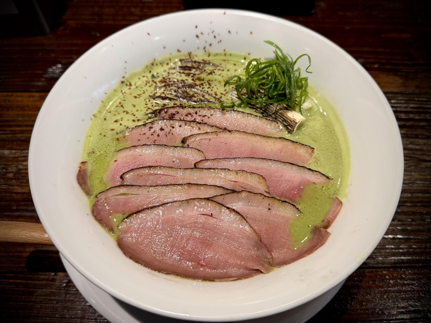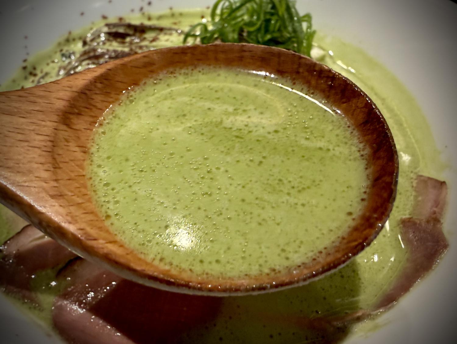 その後、鶏白湯のスープの旨みが口の中に広がり、最後に抹茶の苦味がほんのりと…