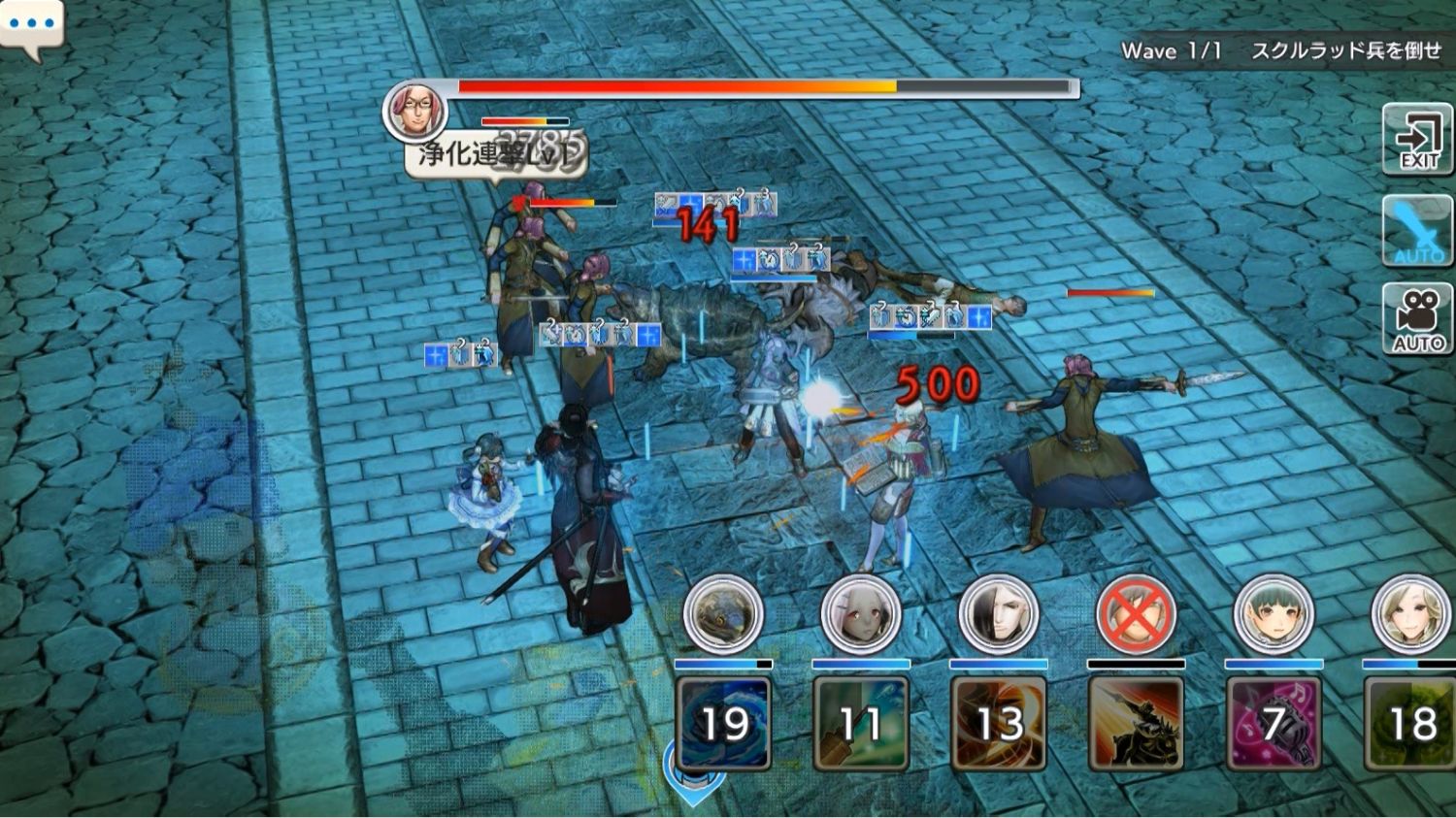 さて、開幕早々、アンダリオが亡くなって、ワニガメが上の3体、右に位置するフィロメナが1体を受け持ちます。ワニガメは挑発をもたないので、フィロメナを攻撃する敵を引き取るわけにはいきません。間にモーガが入って、HPの減った両者を交互に回復します。