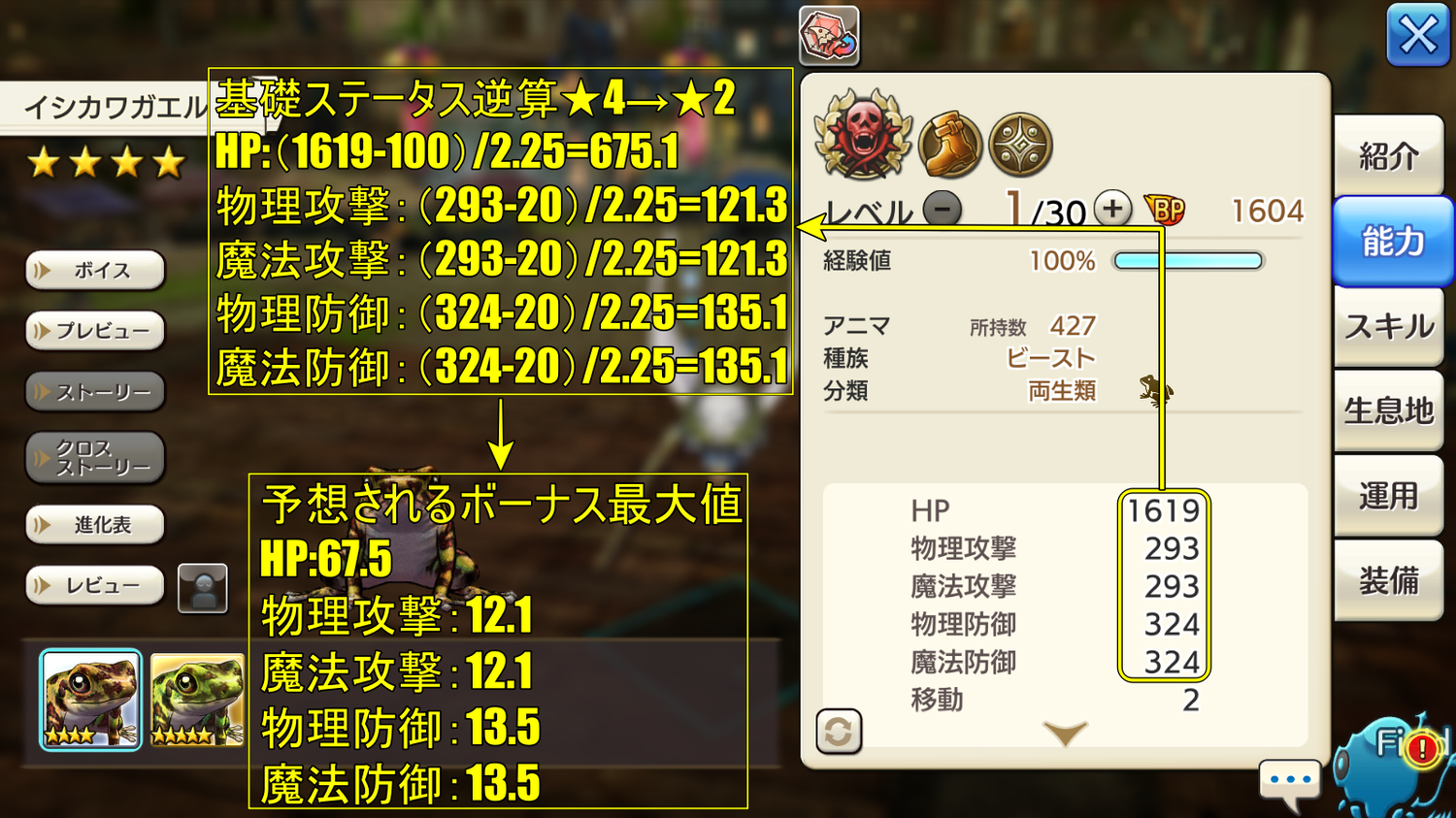 今回は★4ですので図鑑から2段階戻してボーナス値予想としました。