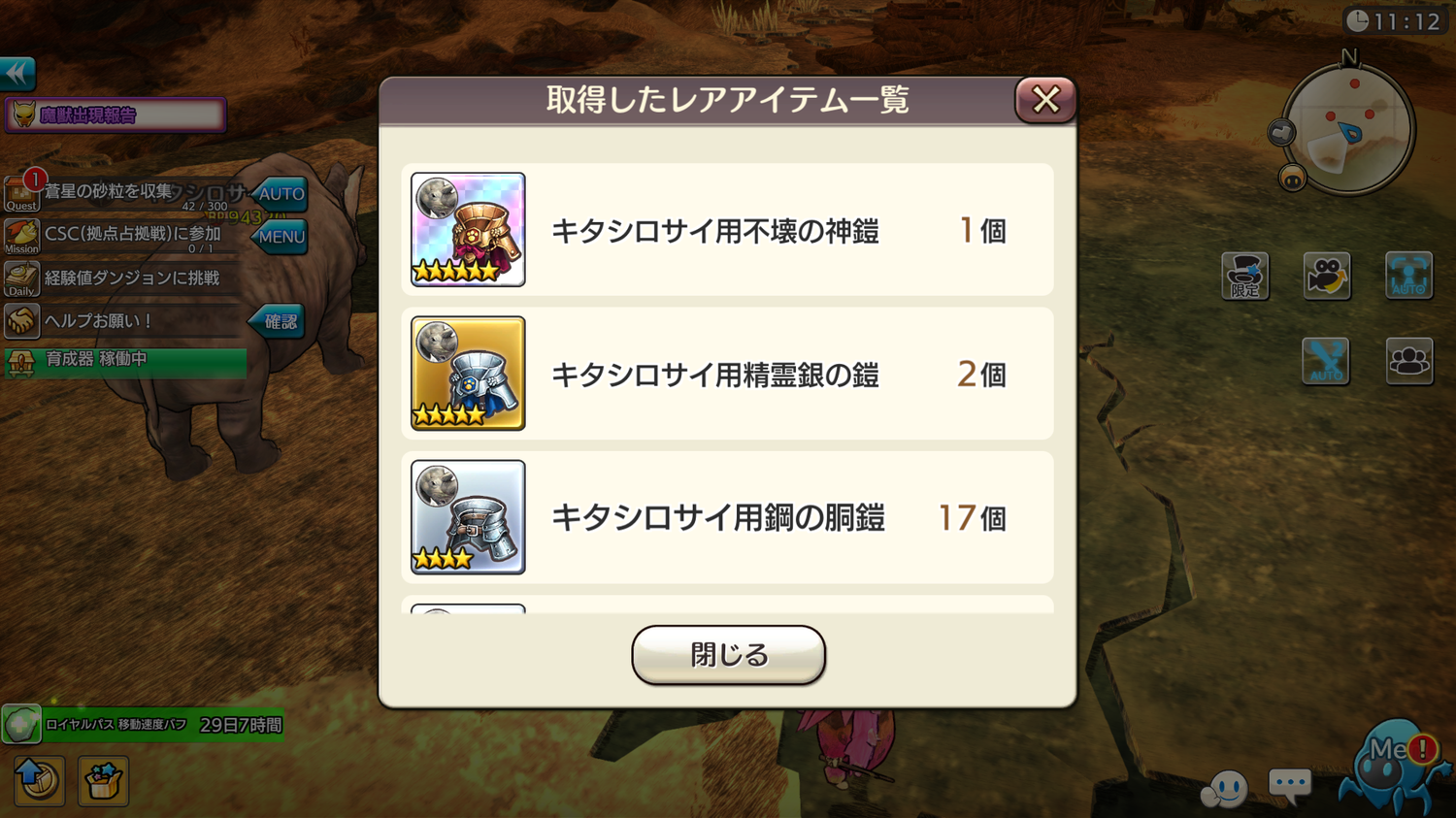 ■キタシロサイの大きな角×5個 → ビースト名「ら行」のアニマ35個