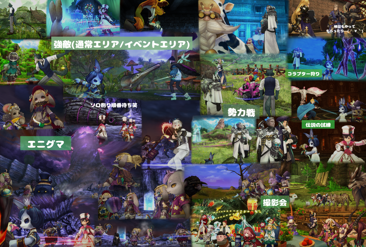 中ボス、大ボス、時限に関して行きたいギルメン達で早組と遅組の時間内に(Ⅲは遅組中心になります…)挑戦しております。レギオン、宝箱狩りはいつでも自由におこなって大丈夫です!(時限の有無はゲーム内掲示板にメモを残しています)深夜のエニグマは夜更かししがちなので基本スケジュールがあり(金土日が中心)それを基にペース配分を行ってますが無理せずに!です。