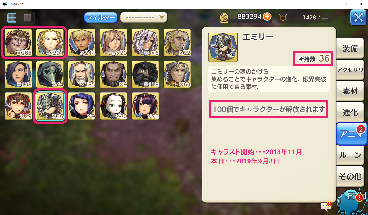 サブ垢は、最初のピックアップガチャでエミリーが出て、アニマもさくさくたまり、作成から2か月あまりでリアリティ☆5、装備両手☆5になりました。