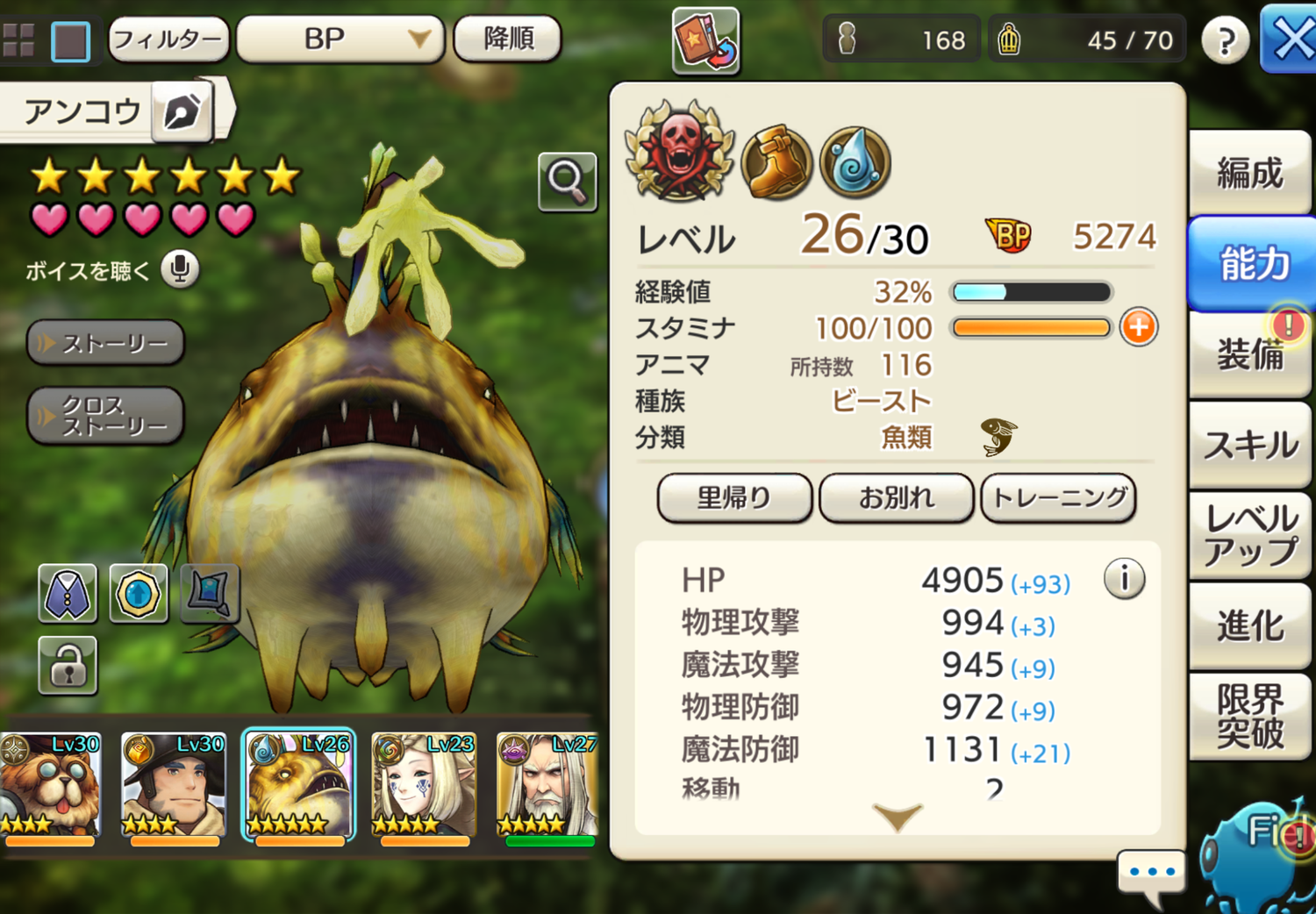 ちなみにこのアンコウ君は、過去にハグレコアトル攻略のために起用したアンコウ君で、無事に変異してくれればずっと手元に置いとけたんだけど