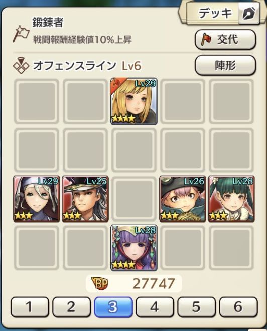 陣形はオフェンスラインで、一番前にソフィア、一番後ろにマリオンです。ソフィアはボスと反対側(右かな?)の敵をタゲって、マリオンのスキルは手動でボス以外の敵を狙って発動します。アルメイダルのスキルはソフィア固定でHPが減った時やヒーラーのCTが溜まってない時に発動するといいです。最初はヒーラー枠でモーガを入れてたんですが、モーガは前線まで出てくるタイプなのですぐやられてしまうため、アルメイダルと入れ替えました。