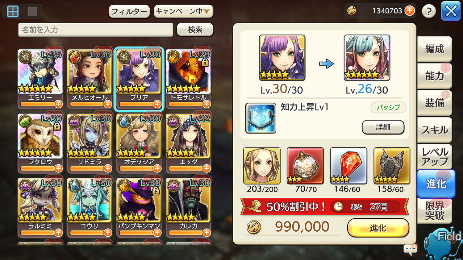 ──エクストラクエスト(プリア&ルーファス)のおかげでプリアニマ200枚突破したので・・・そして、プリアちゃんは衣装で耐性獲得できてナチュラルかわゆくなるので、久々に大枚はたいて(気分的に大枚感)、むりやり☆6進化させました!!