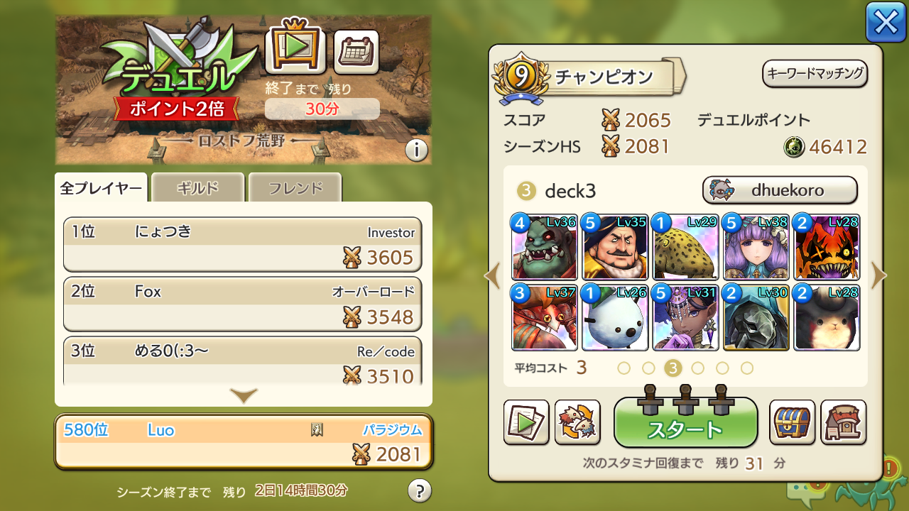2連敗したため一旦止め。時間空けてまたギリギリにもう一回やるかも?結果は1勝2敗。フンボルトってやべえ。あいつ暗闇とか鈍足だけかと思ったら200%もダメージ与えてくんの?なんでそのおまけみたいな強効果。おかしくない?100%とかでよかったろうに。200ってミンミやレーナのASとそう変わらんと思うんだけど。しかもコスト2爆撃とか。だからこそ皆装備を必死こいて集めてたのか。土だから地味にうちと相性悪いし。多分フンボルトとプリア投げられるだけで大会負けるまである。うちの火力と相性悪すぎる。