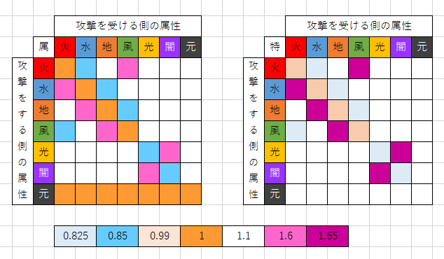 同じ属性相手、 A×0.95×1.05=0.9975 ※光闇の場合は属性不利判定