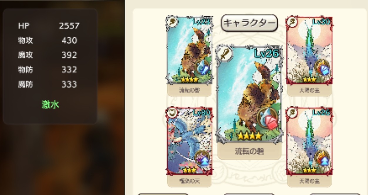 寄せ集めで種類を揃えたりはまだまだ無理ですが取り敢えず激水にして攻撃バフ。